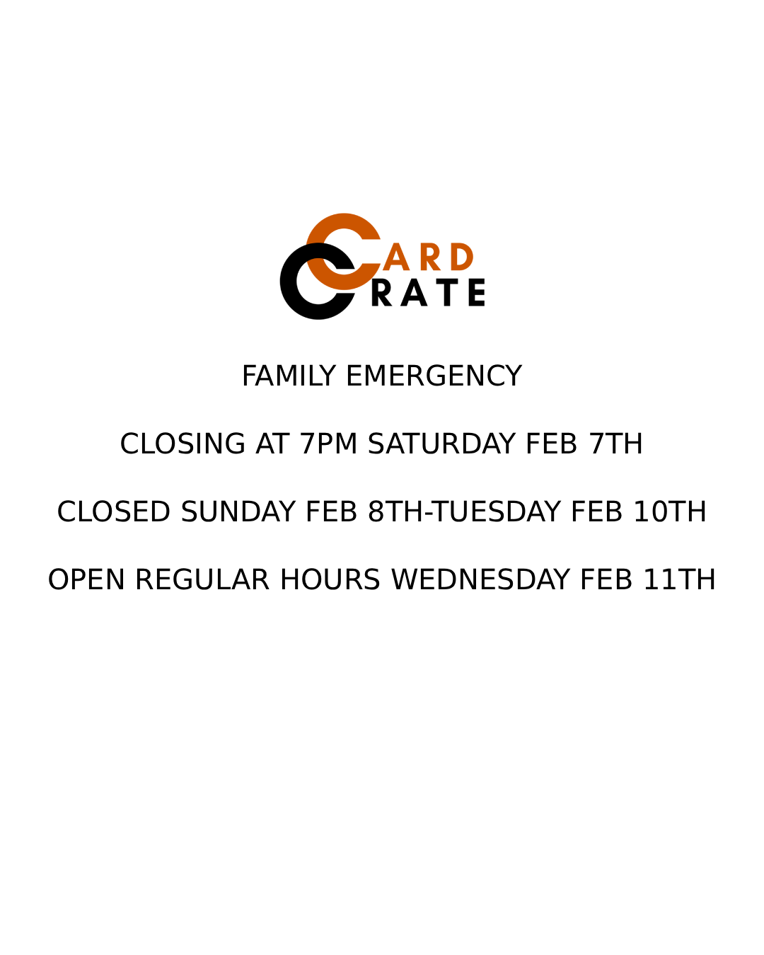 FAMILY EMERGENCY. CLOSING AT 7PM SATURDAY FEB 7TH. CLOSED 8TH-10th. OPEN 11TH.
